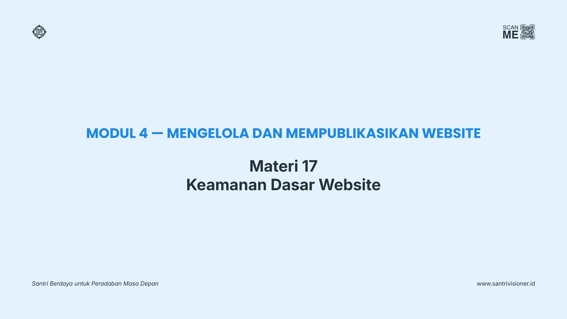 Pada modul ini peserta akan mempelajari cara mengelola konten website pesantren agar tetap aktif dan bermanfaat. Peserta juga akan memahami dasar keamanan website serta langkah-langkah memastikan website pesantren siap dipublikasikan dan dapat diakses oleh masyarakat.